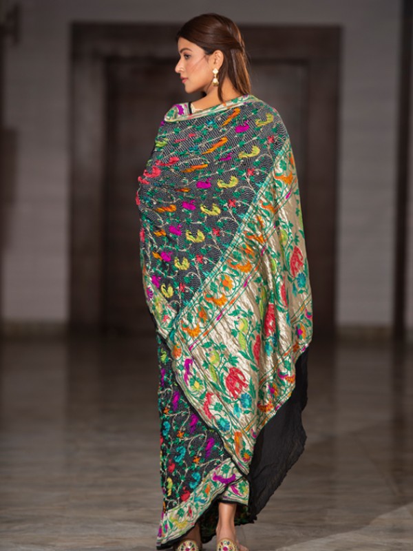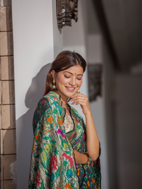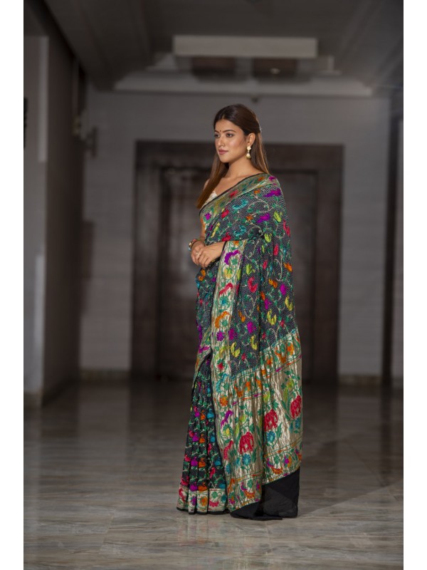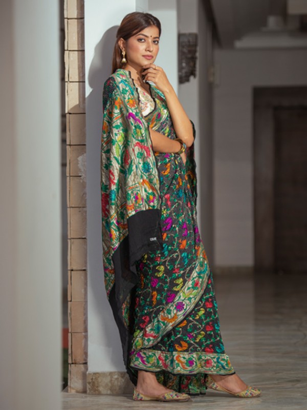 Saree is dyed in black and color and tied with tiny bharti bandhej.