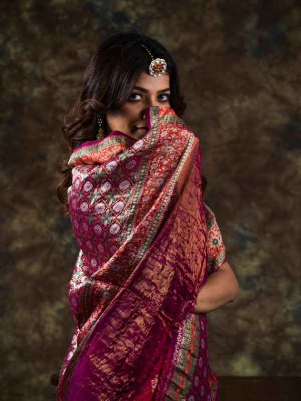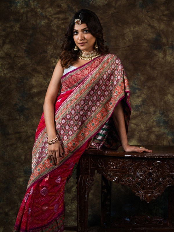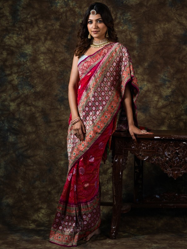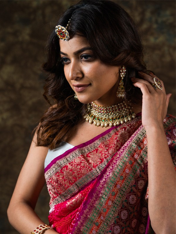 Kadiyal is newly introduced by Tk. Kadiyal saree comes in pure silk. It is lined with banarasi weaved border in tissue. It has contemporary meenakari style butta all over the saree with sarkam bandhej.
