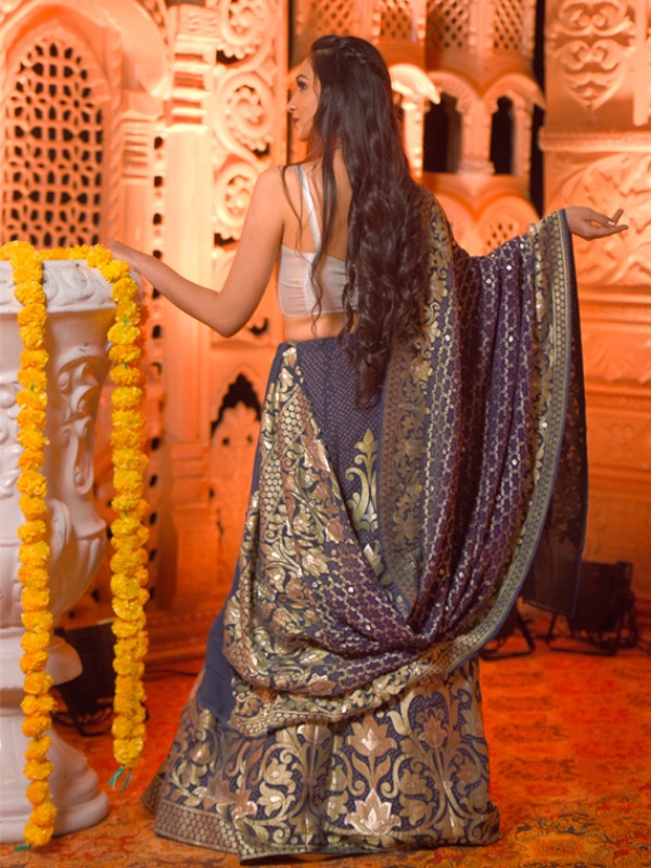 Ardhangini is Indigotic Wedding Lehenga weaved in ganga jamna zari.
