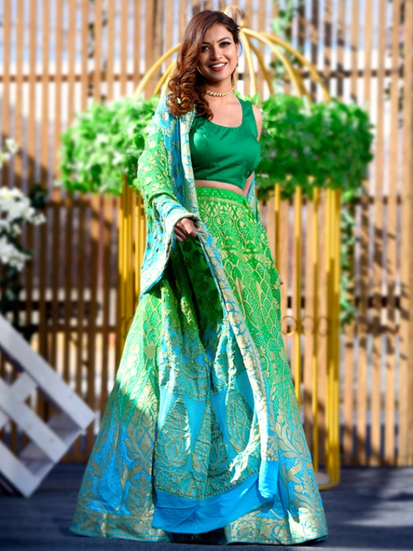 Charu is stylish wedding lehenga with both traditional and trending colors of sea-green and sky.