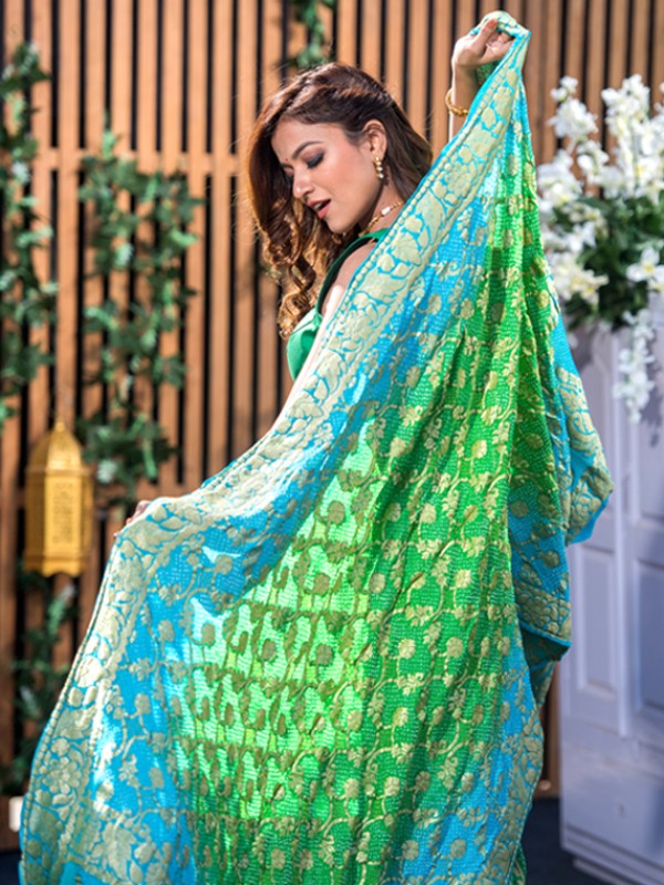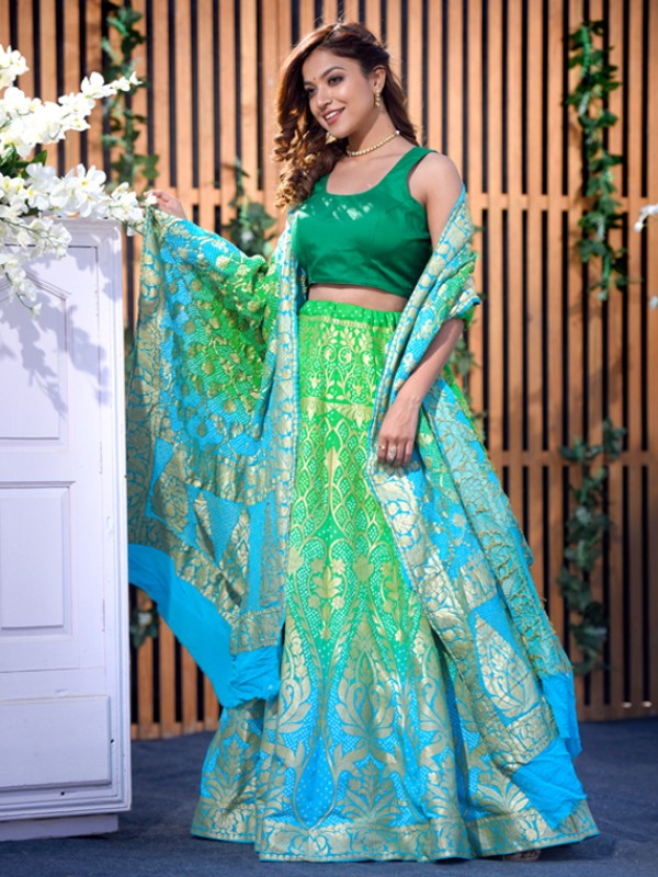 Cool colors are given in a lehenga with signature tiny bharti bandhej.